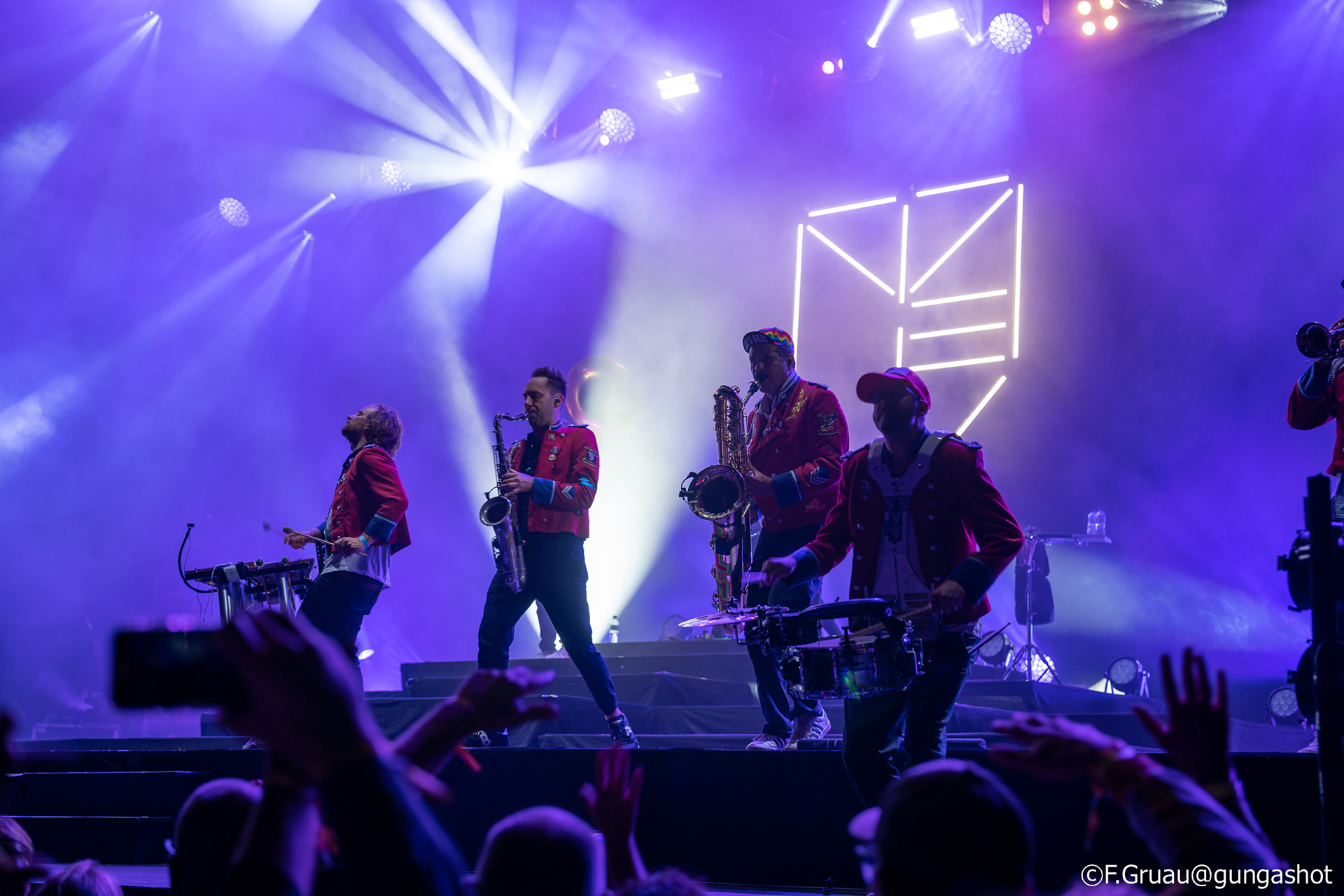 Meute (également typographié MEUTE) est une fanfare techno composée de onze musiciens (percussions et cuivres) de Hambourg, en Allemagne. Le groupe reprend et arrange des œuvres techno, house et deep house par des DJ bien connus, les augmentant avec des rythmes électroniques créés par des instruments de fanfare. Ce faisant, ils cherchent à créer « un nouveau genre en combinant une techno de conduite hypnotique et une musique de fanfare expressive », « détachant ainsi la musique électronique des platines du DJ ». Meute a fait des tournées en Europe, en Amérique et en Afrique australe et s'est produit dans une variété de lieux, notamment des rues de villes, des festivals de musique et des salles de concert classiques. Surprenant, incroyable, dansant, les qualificatifs me manquent. Encore une bonne idée pour le checkin !